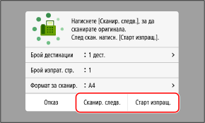За да сканирате допълнителни оригинали, поставете ги върху стъклото за сканиране и натиснете [Сканир. следв.].