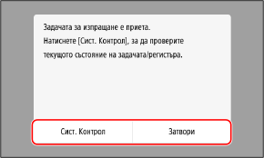 Проверка на състоянието на изпращане и записване и регистрационния файл за сканираните данниПри натискане на [Затвори] се появява екранът за сканиране.