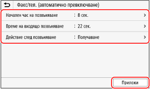Когато [Факс/тел. (автоматично превключване)] е разрешена, за да се определи дали входящото повикване е факс, можете също да конфигурирате настройки като времето за звънене.
