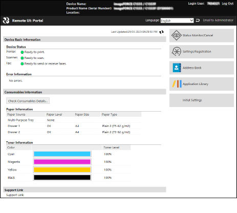 Когато влезете в Отдалечения ПИ, се появява страницата Портал (страницата в горната част на Отдалечения ПИ). От тук можете да проверите състоянието на работа на устройството, да видите различна информация и да промените настройките с бутони.