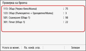 Налични операции на екрана Проверка на броячаЕлементите, показани на екрана, варират в зависимост от вашата държава или регион. Натиснете [Услуга за монит.], за да проверите връзката със сървъра за наблюдение. Изпълнете тази операция, за да изпращате редовно информацията от устройството до сървъра за наблюдение. Натиснете [Пр. конф. устр.], за да проверите конфигурацията на опциите на устройството.