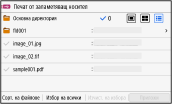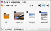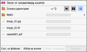 За да изберете всички показани файлове, натиснете [Избор на всички] в долната част на екрана. Ако има както PDF файлове, така и файлове с изображения (JPEG или TIFF файлове), се показва екран за избор на типа файл. Използвайте този екран, за да изберете типа файл, който искате да отпечатате.