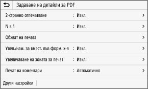 * Това е същата настройка като [N в 1] на екрана за настройки за печат от носител с памет. Но [9 в 1] и [16 в 1] са налични само за [N в 1] на екрана [Задаване на детайли за PDF]. |