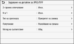Използвайте този екран, за да конфигурирате подробни настройки за печат за JPEG и TIFF файлове, като регулиране на качеството на изображението.