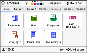 ![]() | Кнопка дії (копіювання) Виклик параметрів копіювання, зареєстрованих як пріоритетні. Назва кнопки відрізняється залежно від параметра. Додавання кнопок дій |