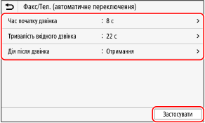 Якщо параметр [Факс/Телефон (автоматичне переключення)] увімкнено для визначення того, чи вхідний виклик є факсом, можна також налаштувати параметри, як-от час дзвінка.
