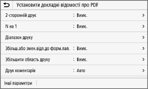 Щоб відобразити цей екран, натисніть [Уст.докл.від.про PDF] на екрані параметрів друку з носія пам’яті.