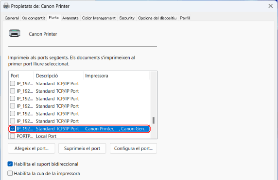 Si es mostra [Port TCP/IP estàndard] a [Descripció], heu d'afegir un port nou. Addició d'un port