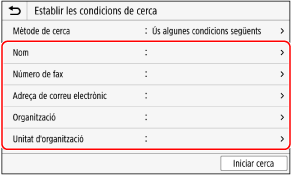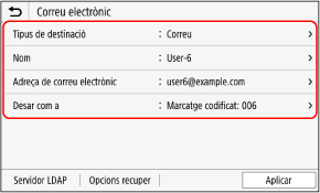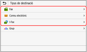 Per obtenir informació sobre la destinació, premeu [Adreça de correu electrònic], [Adreça de l'I-Fax], o [Número de fax], introduïu aquesta informació i, a continuació, premeu [Aplicar].