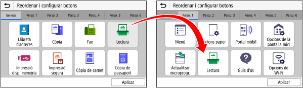 Podeu reordenar els botons de la pantalla [Inici] i moure els botons a altres pestanyes.