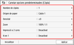 Podeu canviar les opcions predeterminades per a la lectura, la còpia i altres funcions a les quals s'accedeix mitjançant el tauler de control.