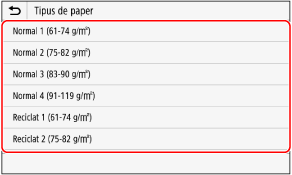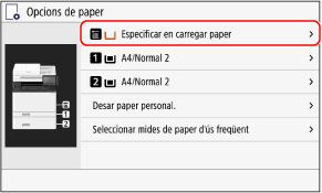 Si es carrega paper a la safata multiús, apareix la pantalla per configurar la mida i el tipus de paper al tauler de control.