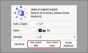 Podeu seleccionar el mode de color (blanc i negre o color) per a cada original. Per copiar el següent original en blanc i negre, premeu [Llegir següent B/N]. Per copiar en color, premeu [Llegir següent Color].