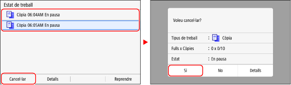 Si apareix la pantalla de llista de tasques, seleccioneu la tasca que vulgueu cancel·lar i premeu [Cancel·lar] [Sí].