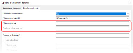A la pestanya [Introduir destinació], introduïu un número de fax. Si es pot introduir [Confirma número de fax], introduïu el mateix número de fax.
