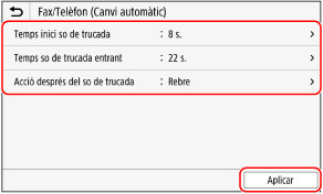 Si s'activa [Fax/Telèfon (Canvi automàtic)] per determinar si la trucada entrant és un fax, també es poden configurar paràmetres com ara el temps de to.