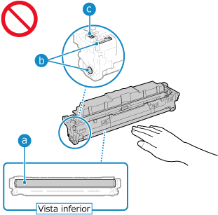 No ratlleu la superfície del tambor (  ) ni l'exposeu a la llum. No toqueu els contactes elèctrics (  ) ni la memòria del cartutx de tòner (  ).