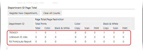 Podeu veure el nombre de pàgines impreses i copiades per a cada ID de departament quan la gestió d'ID de departament està activada.