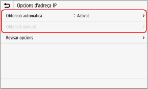 La pantalla [Opcions adreça IP (Obtenció automàtica)] es mostra a la pantalla.