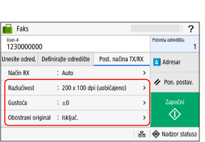 Na kartici [Post. načina TX/RX] konfigurirajte izvorne postave skeniranja. Postavke skeniranja izvornika za faksiranje
