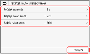 Postavite trajanje zvonjave i zadanu radnju prilikom primitka faksa pa pritisnite [Primijeni].