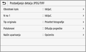 Na ovom zaslonu konfigurirajte detaljne postavke ispisa za JPEG i TIFF datoteke, poput podešavanja kvalitete slike.