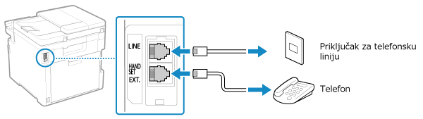 Priključite priloženi telefonski kabel u utičnicu za telefonsku liniju na uređaju (LINE) i u zidnu utičnicu za telefonsku liniju.