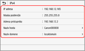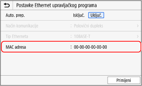 Podaci o IP adresi uređaja i MAC adresi potrebni su za upotrebu sučelja Remote UI (Udaljeni ID) i konfiguriranje postavki vatrozida. Provjerite te trenutačne postavke.