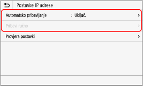 Obično se postavlja na [DHCP]. Međutim, ako je mogućnost [DHCP] postavljena u okruženju u kojem nije moguće upotrebljavati DHCP, uređaj će i dalje potvrđivati postavku automatskog pribavljanja unutar mreže, što će dovesti do nepotrebne komunikacije. Dok se DHCP ne upotrebljava, namjestite tu postavku na [Isključ.].