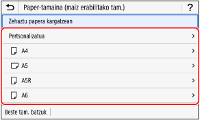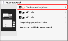Papera erabilera anitzeko erretiluan kargatzen denean, paper-tamaina eta mota ezartzeko pantaila bistaratuko da kontrol-panelean.