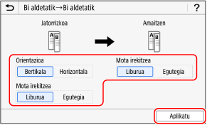 * Baliteke bi aldeetatik kopiatzeko aukera erabilgarri ez egotea hainbat paper-tamaina eta motarekin.