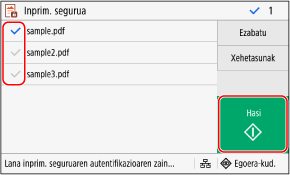Hautatu inprimatu nahi dituzun datu seguruen kontrol-laukia eta sakatu [Hasi].