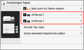 Standardmäßig sind Papierformat und Papiertyp der Papierkassette auf A4 und Normal 2 eingestellt. Wenn Papier eines anderen Formats oder Typs eingelegt wird, ändern Sie die Papiereinstellungen.
