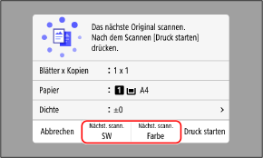 Wenn ein Original auf das Vorlagenglas gelegt und mithilfe 2-seitigem Kopieren oder N auf 1 kopiert wird, erscheint der Bildschirm zum Scannen des nächsten Originals.