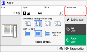 Drücken Sie [Kopienanzahl], geben Sie mit den Zahlentasten die Anzahl der Kopien ein, und drücken Sie dann [Schließen].