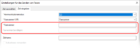 Geben Sie auf der Registerkarte [Ziel eingeben] eine Faxnummer ein. Wenn [Faxnummer bestätigen] eingegeben werden kann, geben Sie die gleiche Faxnummer ein.