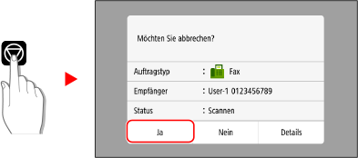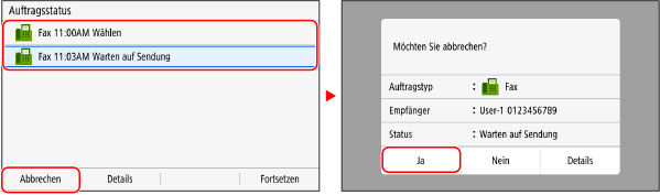 Wenn ein Bildschirm mit der Auftragsliste angezeigt wird, wählen Sie den abzubrechenden Auftrag aus, und drücken Sie [Abbrechen]