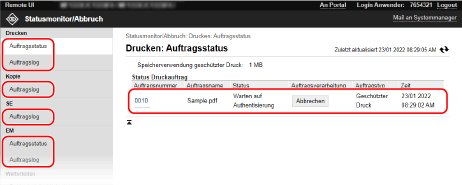 Wenn Sie Ihren Benutzernamen unter [Anwendername] eingegeben haben, als Sie sich im allgemeinen Benutzermodus anmeldeten, ist nur der Druckauftragsstatus für diesen Benutzer sichtbar.