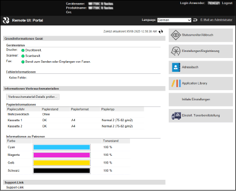 Wenn Sie sich bei Remote UI anmelden, wird die Portalseite (Hauptseite von Remote UI) angezeigt. Von hier aus können Sie den Betriebsstatus des Geräts überprüfen, verschiedene Informationen anzeigen und die Einstellungen per Schaltflächenbetätigung ändern.