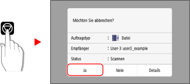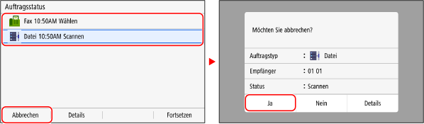 Wenn der Bildschirm mit der Auftragsliste angezeigt wird, wählen Sie den abzubrechenden Auftrag aus, und drücken Sie [Abbrechen]