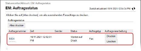 Wenn Sie auf die Auftragsnummer klicken, wird der Bildschirm [Auftragsdetails] angezeigt. Sie können die Empfangszeit und die Anzahl der Seiten anzeigen und eine Vorschau des Faxes ansehen.