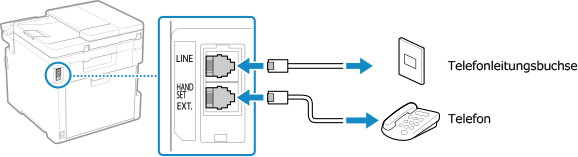 5 | Schließen Sie das mitgelieferte Telefonkabel an die Telefonanschlussbuchse (LINE) am Gerät und an den Telefonanschluss an der Wand an. ![]() Schließen Sie das Telefon an die externe Telefonbuchse (HAND SET/ EXT.) des Geräts an. Wenn Sie ein Telefon mit Faxfunktion anschließen, stellen Sie sicher, dass die Einstellung für den automatischen Faxempfang am Telefon deaktiviert ist. Je nach Typ des angeschlossenen Telefons kann das Gerät möglicherweise keine Faxe ordnungsgemäß senden oder empfangen. |