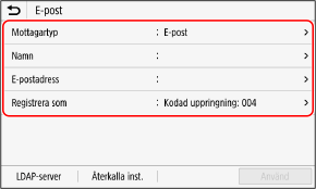 Om du vill använda en LDAP-server ska den LDAP-server där du vill söka efter mottagare registreras i enheten. Registrera LDAP-servrar |