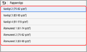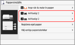 Standardinställningen för pappersformat och papperstyp är A4 och Vanligt 2. Ändra pappersinställning om du använder annat format eller annan typ.