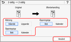 3 | Ange orientering och öppningstyp. Tryck på [Använd]. Skärmen [Andra inställn.] visas igen. |