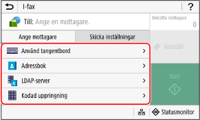 Ange mottagareAnvänd [Adressbok] eller [Kodad uppringning] när du vill skicka kopior till andra mottagare eller hemliga mottagare.