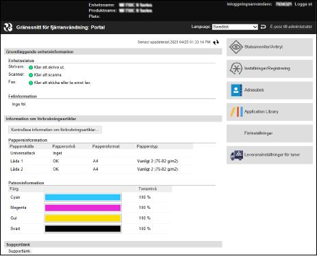 När du loggar in på fjärranvändargränssnittet visas portalsidan (startsidan i fjärranvändargränssnittet). Härifrån kan du kontrollera enhetens åtgärdsstatus, se olika typer av information och ändra inställningar för knappfunktionerna.