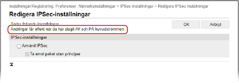 [Inställningar/Registrering] Klicka här för att visa skärmen [Inställningar/Registrering]. Om du är inloggad i administrationsläge kan du ändra alla inställningar och utföra åtgärder som t.ex. att spara och importera data. Inställningar som kan anges på skärmen [Inställningar/Registrering] överensstämmer nästan helt med dem på kontrollpanelen, men vissa inställningar kan endast anges antingen på kontrollpanelen eller med gränssnittet för fjärranvändning. Alternativ på inställningsmenynBeroende på inställning kan du behöva starta om enheten för att inställningen ska verkställas. Om en omstart krävs visas ett meddelande överst på skärmen. |