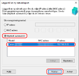 2 | Välj [Upptäck automatiskt] och enheten och klicka på [Nästa]. Klicka på [Uppdatera] om enheten inte visas. Om enheten ändå inte visas väljer du [IP-adress] eller [MAC-adress] och anger enhetens IP- eller MAC-adress. Klicka sedan på [Nästa]. |