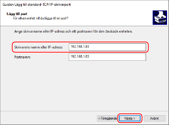 3 | Ange IP-adressen eller DNS-namnet (värdnamnet) och klicka sedan på [Nästa]. Portnamnet anges automatiskt. Ändra det om det behövs. När [Ytterligare portinformation krävs] visas Följ anvisningarna på skärmen. För att ange [Enhetstyp] väljer du [Canon Network Printing Device with P9100] i [Standard]. |